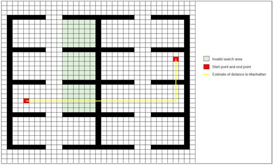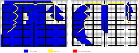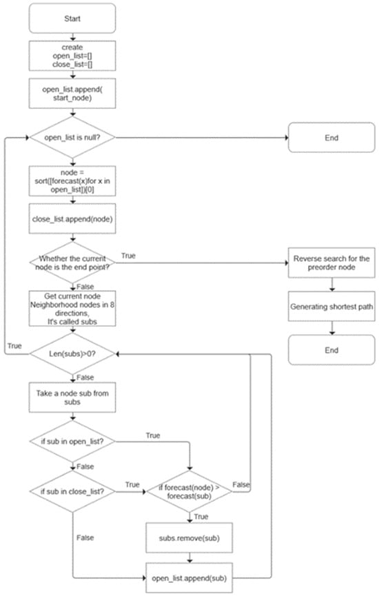 The traditional breadth-first algorithm in the path planning problem is based on two-dimensional coordinates, each time to point up, down, left, and right in four directions of traversal search, until the endpoint is found. Because people can travel in a diagonal direction, the eight squares of the current point are searched for. In the worst case, the algorithm needs to traverse all the points on the whole map, which greatly reduces the efficiency of the search. The A* algorithm introduces the concept of cost, and the total cost of the actual search point is composed of two parts, namely, the estimated cost and the current point cost. The current cost is the actual search distance from the starting point to the current point, while the estimated cost is the Manhattan distance. When the search node generates results with the total cost during the search process, the direction with the minimum total cost is always chosen to search until the search reaches the endpoint, in which case the search efficiency of the algorithm is greatly improved [52,53].