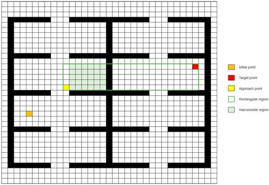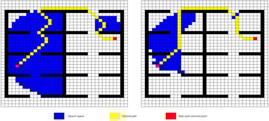 However, the A* algorithm still has many invalid search ranges in the parking lot or garage scene with a large number of semi-closed spaces. In the following, a typical 35 × 35 network topology legend is set to discuss the solution to the problem. In the 2D planar map of size 35 × 35 in Figure 14, green grids are all invalid search paths, and for the case in Figure 14, it can be explained that the improved A* algorithm is based on spatial reachability.