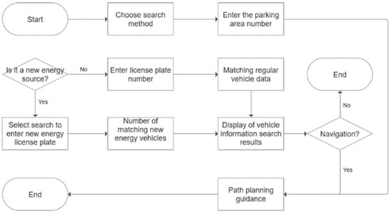 The PC client software system of an intelligent reverse car search system mainly involves the query interface, search result interface, and path navigation interface. Query interface users can choose license plate search or parking spot search according to their own needs. According to the different input information of the user, the MySQL database query language is used reasonably to speed up the data processing process, the data processing is carried out in the server, the queried vehicle information is displayed on the result interface, and the relevant path guidance interface is designed to facilitate the user’s reverse car search requirements. The overall operation flow of the PC client is shown in Figure 24.