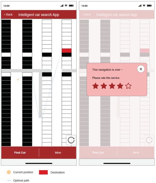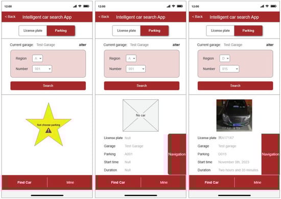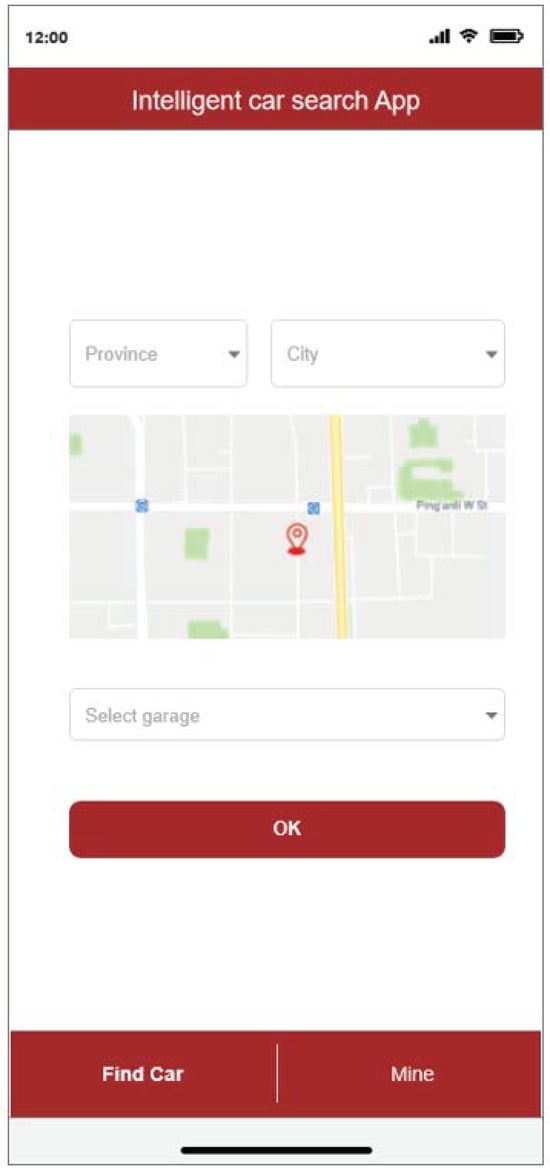 The mobile App interface is mainly divided into the car search function and the “Mine” account setting function. The search method is divided into license plate search and parking space search. In the design, the incorrect license plate input or the current search license plate that is not in the current garage is fully considered, and the user can be supported to search through the parking number when the user knows the parking number.