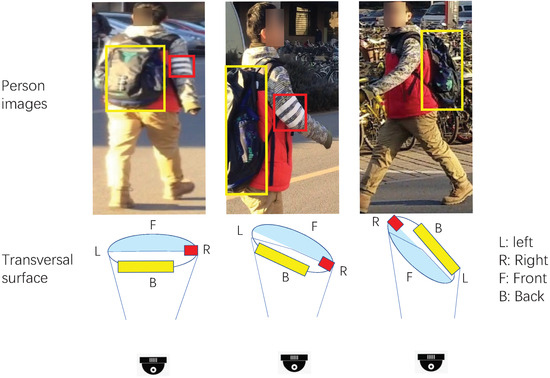To obtain stable and effective position information, we analyze the position variation when changing viewpoints and fixing other variables. We discover that the relative position between visible parts has some characteristics. In circular views, since only half of the visible part of the whole body can be captured, the orientations for horizontal and vertical components of relative positions between visible patterns are invariant. As shown in Figure 1, the horizontal components of relative positions between the bag shown in yellow boxes and the white parallel lines shown in red boxes are invariant if the comparable patterns are visible. The vertical components are also invariant for persons in images captured in video surveillance, which are almost never upside-down. For the scale of relative position, it is mainly related to the distances from viewpoint to person location and the spin angle of body rotation. In practical scenarios, the distances between the camera and the pedestrians are much greater than the widths of pedestrians. We can suppose it is a nearly linear correlation between the relative position and the distance of the viewpoint and captured part. Hence, the impact of neighbor body parts can be defined as a linear form. Furthermore, visual chirality [16], an orientation phenomenon of images, also proves usefulness with regard to the aforementioned orientation clue for discrimination. Note that horizontal flipping with the same label, which is widely used in data augmentation, would probably bring disorder to the calculation of relative positions.