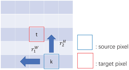 An example of Relative Position Weight calculation. Each grid represents a pixel of the feature map. The blue arrows show the orientations of the factorized relative position from the source pixel to the target pixel.