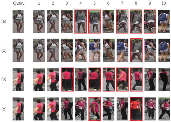 Comparison of retrieval results on the Market-1501 dataset. (a) Baseline; (b) MPGA-Net. Figures with red boxes represent the wrong query results.
