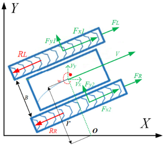 In the above equation, is the mass of the dual-motor tracked chassis system, and , is the velocity component of the dual-motor tracked chassis system in the X, Y direction. , is the driving force of the left and right tracks of the dual-motor tracked chassis system; , is the force in the X direction on the left and right tracks of the dual-motor tracked chassis system; , is the force in the Y direction on the left and right tracks of the dual-motor tracked chassis system; , is the resistance to moving on the left and right tracks of the dual-motor tracked chassis system; is the inertia of the dual-motor tracked chassis system; is the angular speed of the dual-motor tracked chassis system; is the track distance of the two-motor tracked chassis system; is the steering resistance moment; is the moving speed of the two-motor tracked chassis system; is the coefficient of adhesion between the track and the ground; is the gravity acceleration; is the length of the track; and is the coefficient of rolling friction of the track.
