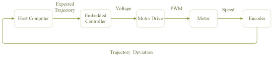 After establishing the track dynamics model and performing force decomposition, the motors were taken as the main control object and the controller controls the driving force of the robot’s left and right wheels to realize trajectory tracking. The control of the caterpillar track inspection robot was essentially performed by controlling the caterpillar driven by the single-side motors. The closed-loop speed regulation system was mainly composed of an embedded controller, a DC motor, and a speed encoder; the overall flowchart is shown in Figure 5. The speed encoder is in charge of converting and encoding the motor speed into corresponding square wave pulse signals for the embedded controller to process. The path control is given back to the host computer through the LiDAR and depth camera, and the desired path is changed to form a closed-loop control system.