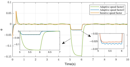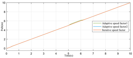 The error-based adaptive speed factor , while is smaller, is larger, and is larger. The larger the speed factor, the greater the stability, the greater the disturbance resistance, and the higher the control accuracy, but the larger the overshoot will also be, which may cause the control force to oscillate. Therefore, two different adaptive speed factors, adaptive speed factor 1 and adaptive speed factor 2, were selected for comparison experiments with the iterative speed factor. The simulation was tested in Matlab/Simulink 2021. A sudden change signal was added to simulate the perturbation added to the robot when t = 0.3 s, and a square wave signal was added to simulate the perturbation added to the motor during 5–6 s. The simulation result of the path tracking is shown in Figure 6. From the path following the error in Figure 7, it can be seen that the error-based adaptive speed factor cannot eliminate the jitter phenomenon, while the iterative speed factor can eliminate it. From Figure 8, it can be seen that the control force of the iterative speed factor is smoother and the vibration amplitude is smaller.