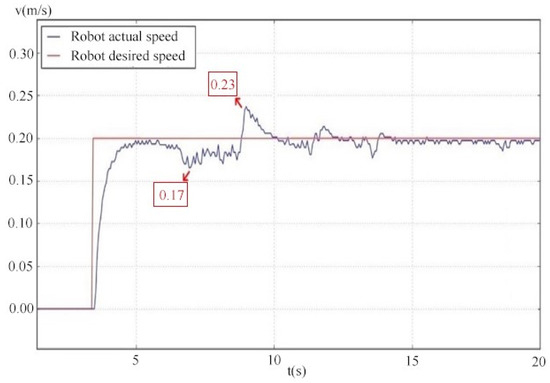 As can be seen in Figure 9, in the actual cable trench environment, the minimum speed value of the crawler motor was 0.17 m/s and the maximum speed value was 0.23 m/s when it was perturbed. So, the influence of the disturbance factor on the speed of the caterpillar motor was ±0.3 m/s. It provided a basis for the subsequent simulation of the controller.
