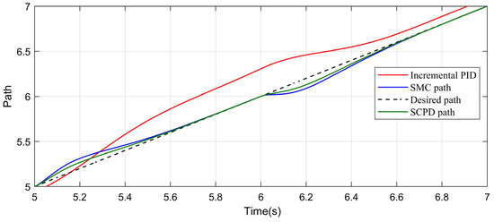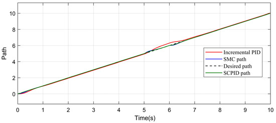 From Figure 12, the SCPD had the strongest anti-disturbance ability and recovered to the desired path very fast, the SMC control also had good anti-disturbance ability, while the incremental PID had poor anti-disturbance ability and could not recover to the desired path before the disturbance disappeared.