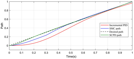 From Figure 11, it is shown that SCPD had the smallest overshoot of 0.15 and stabilized in 0.2 s, while SMC and incremental PID had overshoots of 0.22 and 0.51, which stabilized in 0.45 s and 0.7 s, respectively. It can be seen that the response time of SCPD was shorter and the robustness was higher.