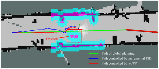 The trajectories run by the different control algorithms at the underground cable trench site are shown in Figure 14. The purple square in the figure shows the dynamic obstacles to avoid collision between the robot and the cable, and the blue square shows the obstacles after the expansion coefficient. From Figure 15, the robot had the highest smoothness under SCPD control, which greatly reduced the total length of the path. To further verify the reliability of the algorithm, different starting and ending points were set in the cable trench environment with distances of 10 m, 20 m, and 30 m, respectively, and the results are shown in Table 2. Compared with incremental PID, SCPD increased the robot’s moving speed by 21% and reduced the path by 6.5%.