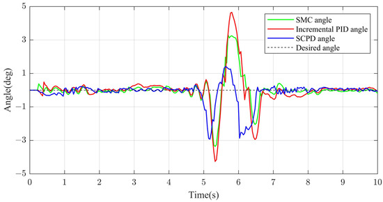 The superiority of the SCPD algorithm can be seen in Figure 15. Although incremental PID, SMC, and SCPD are stable under regular operation, compared with incremental PID and SMC, SCPD was more stable at the beginning of the operation and had better control accuracy. When crossing an obstacle, the angle of the incremental PID varied the most, within an adjustment range of ±4.7 degrees; the angle of the SMC varied within an adjustment range of ±3.2 degrees; and the angle of the SCPD varied within an adjustment range of approximately −3 degrees to 1.5 degrees. So, the maximum offset angle of SCPD was 56.7% and 10.3% smaller than incremental PID and SMC, respectively. Furthermore, although the three algorithm’s variation in adjustment time was not significant, the SCPD was also the best one.