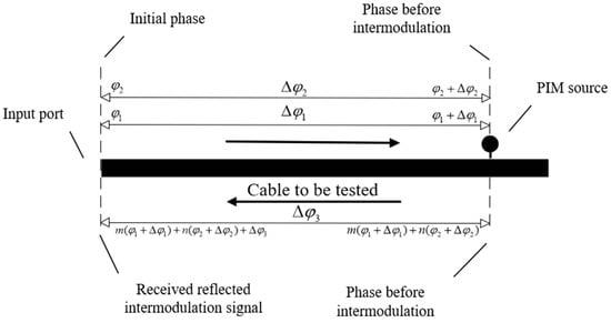 To begin with, we denote the frequency and initial phase of the test signals and the intermodulation signal as , , and and , , and , respectively. When test signals pass through a PIM source, new frequency components are generated. The delays of the signals under test that occur within the cable under test are denoted as and , and the delay that elapses via the intermodulation signal reflecting the input port from the PIM source is represented as .