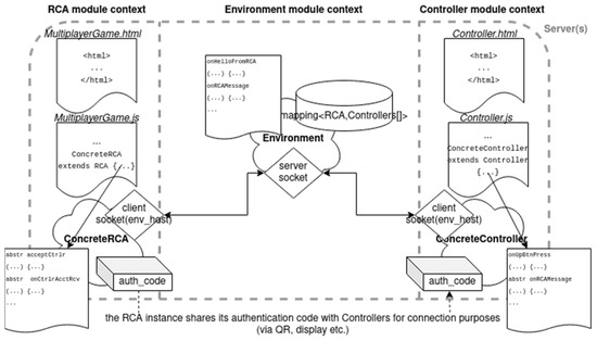 The RCA, in the narrowest sense, is an abstract class representing an interface mediating the communication between a client web application and the server socket contained in an Environment instance through its own client socket instance. In a broader sense, it encompasses both the abstract class and its context, which includes the aforementioned client application. A detailed illustration of the RCA context is provided on the leftmost side of Figure 2.