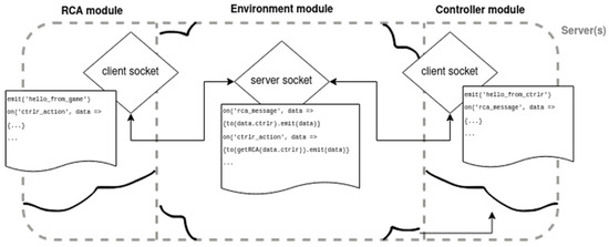 In the following subsections, we describe in more detail not only the three modules, but also the context that the framework is intended to be incorporated in (illustrated in Figure 2). The code cards in the figure represent main code chunks, all of which can interact provided they run on the same host. Moreover, the object blobs (ConcreteRCA, Environment, and ConcreteController) correspond to concrete object instances existing in memory. Lastly, it might be beneficial to note that the RCA and Controller as socket wrappers also serve as mediators for client applications (main application or remote controller interface) via their abstract classes, through which the developer defines implementation-specific behavior and client–application interaction. The classes were designed to be abstract in order to force definition of implementation-specific behavior, such as the Controller acceptance condition for the RCA or actions triggered by message reception on the Controller. The Environment’s workflow is completely automated and functions exactly the same regardless of context specifics, so it can be instantiated as it is without any extension.