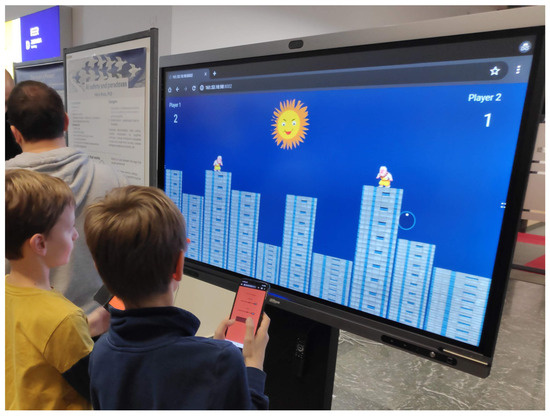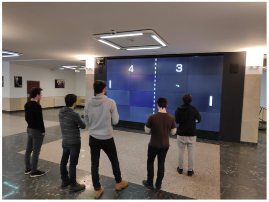 The game was tested multiple times by different groups of players on a large screen in the hall of the University of Zagreb, Faculty of Electrical Engineering and Computing, and was also used during events such as Open Day or Museum Night (testing illustrated on Figure 7). Open Day and Museum Night are two annual science outreach events at the Faculty that gather the largest number of visitors, approximately 3500–4000 people each. Throughout the entire event, the Pong game was displayed on a large screen in the hall and could be played by visitors passing by. Next to the screen, there was usually a person assisting and explaining to visitors how to start the game (e.g., telling them that they should use their phones, helping to scan QR codes, and similar tasks). However, even when that person was not present, most visitors quickly discovered how to start the game. Players were diverse, ranging from elementary school children to their grandparents, from ICT and technical experts to visitors with very limited knowledge of technology. According to the game logs, over 1200 rounds were played, and users connected either through the university’s Wi-Fi (or available Eduroam system) or via their own mobile internet providers.