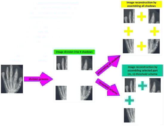 Figure 1 shows a schematic view of the process of dividing an X-ray image of a hand bone with visible sarcoidosis. The image has been divided into four parts. In the data splitting process, it is necessary to assemble all four parts to reconstruct the original image. In the process of data sharing, it is necessary to assemble a smaller number of parts to reconstruct the image—in this case, the (3, 4)-threshold scheme was used, which means that three of the four parts of the secret are required to be assembled to reconstruct the original image.