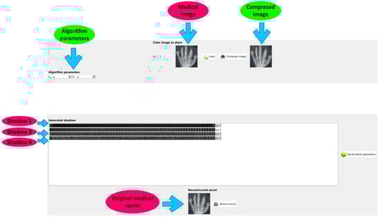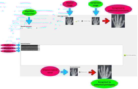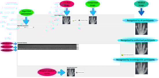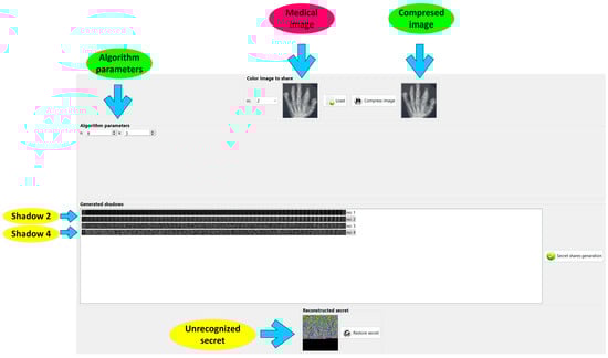In this case, the process of reading the original image will only be possible if all the required parts of the secret are assembled. The assembly of a smaller number of parts, on the other hand, will not reveal the content contained in the image because medical images consist of a group of images whose careful analysis guarantees their correct reading. Any even slight blurring or illegible parts of the image can result in the content of the medical image being determined in a haphazard manner. In the case of medical imaging, this can result in an overly broad disease spectrum. Even common medical knowledge does not, in the case of medical imaging, provide a clear indication of what can be visualized in a distorted or illegible image. Thus, this is a specific example demonstrating that correct reading/restoration of images is necessary to properly understand the content contained in the image and to fully comprehend it. This is a non-essential process that applies to medical images depicting any of the following: