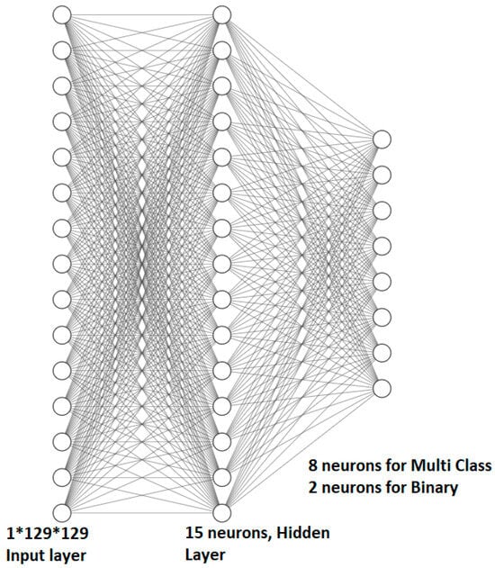 As shown in Figure 5, the ANN model is an extremely shallow model with only a single hidden layer with 15 neurons and consists of input and output layers. In this model, the input is a 1 × 129 × 129 grayscale image, and the input layer should effectively accept this input. As shown in Figure 6, the input layer is set only for illustration purposes as it does not contain any learnable parameters, unlike the hidden and output layers. These two layers have numerous learnable parameters, as shown in Table 4 (for the binary-class ANN model). In the case of multi-class classification, the output layer of the network consists of eight neurons, representing the assumed seven classes of attacks along with the normal class from the CSE-CIC-IDS2018 dataset. However, when performing binary-class classification in both the ANN and CNN networks, the number of neurons in the output layer is reduced to two.