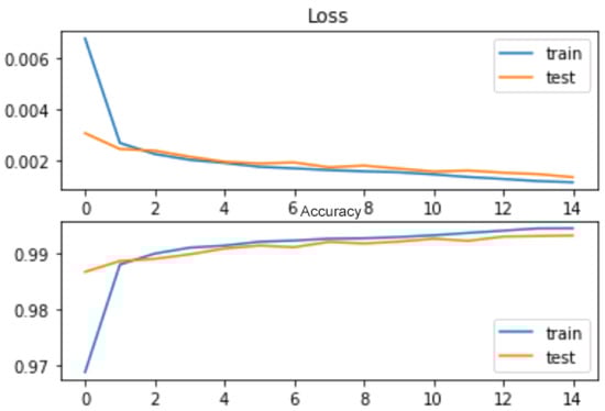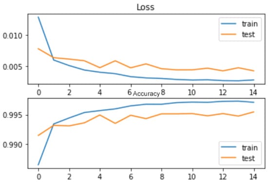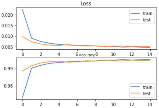 In addition to binary classification, our system demonstrates exceptional performance in multi-class classification tasks. All the results demonstrated excellent performance both for the NSLKDD and for multi-class classification in the CSE-CIC-IDS2018 datasets. The confusion matrix as shown in Figure 12 illustrates the accurate classification of various attack types (i.e., classes Normal as normal, Hulk: Attack1, GoldenEye: Attack2, Slowloris: Attack3, Slowhttptest: Attack4, LOIC-HTTP: Attack5, LOIC-UDP: Attack6, and HOIC: Attack7 as shown in Table 6) using the CNN lightweight model for multi-class classification. In addition, we have also evaluated our system’s performance by testing it with a mixture of these two datasets, which belong to different network versions and time instances and serve as inputs to our proposed system. Subsequently, our system could effectively classify the mixed normal and attack signals without difficulties, as observed in Figure 13 (loss/accuracy) for binary-class classification (achieving train: 0.9955, test: 0.9937 accuracy). This indicates the versatility and adaptability of our proposed approach to handling diverse network traffic scenarios.