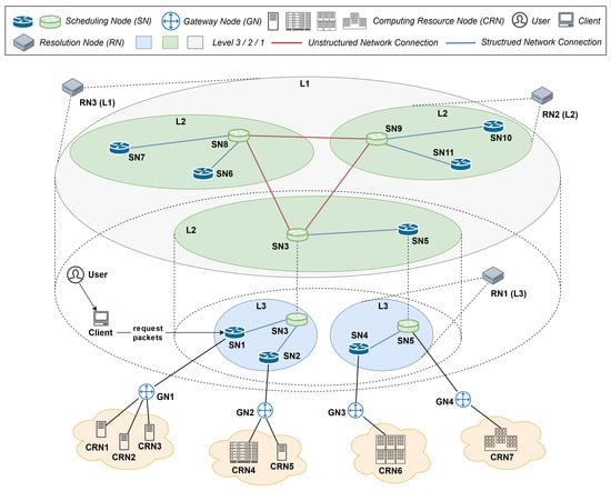 The Topology Construction Module utilizes the ID Management Module and ICN name resolution system to build a semi-distributed structured tree-like topology and structured connections among SNs within each scheduling domain at the L3 and L2 levels sequentially. The SN with the minimum average communication delay to other SNs within the domain is selected as the root node, and the root node of the lower-level scheduling domain also belongs to the scheduling domain at the upper level, with the corresponding resource scheduling service identifier (L3 is the lowest level). Subsequently, within the scheduling domain at the L1 level, the module establishes a fully distributed unstructured topology and unstructured connections among SNs. Ultimately, the hierarchical topology structure depicted in Figure 1 is constructed.