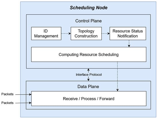 The SNs in IPCRSA also serve as ICN nodes, implementing computing resource scheduling based on ICN. As depicted in Figure 2, the composition structure of SNs can be divided into the control plane and the data plane. The main function modules in the control plane include the ID Management Module, Topology Construction Module, Resource Status Notification Module, and Computing Resource Scheduling Module. The data plane is responsible for receiving, processing, and forwarding computing resource request packets.