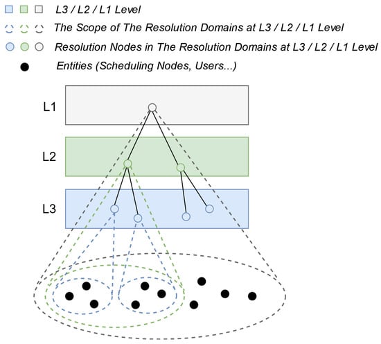 Figure 1 illustrates the overall design of IPCRSA. Its network topology is divided into three levels: L3, L2, and L1. The main entities include the Scheduling Node (SN); Gateway Node (GN); Computing Resource Node (CRN); and User Client (Client), User, and Resolution Node (RN). There is a one-to-one connection relationship between SNs and GNs, and GNs establish either a one-to-one or one-to-many connection relationship with CRNs. The L3, L2, and L1 level network topologies and various entities within their coverage areas collectively constitute the scheduling domains in IPCRSA at levels L3, L2, and L1. The specific functions of each entity will be explained in the following sections.
