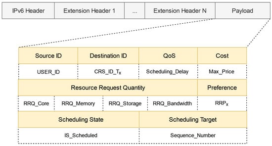 Within an evolutionary ICN environment compatible with TCP/IP, IPCRSA designs a computing resource request packet format based on the IPv6 extension header, as illustrated in Figure 4. Firstly, two crucial fields, Source ID and Destination ID, are added to the packet header. The Source ID is filled with USER_ID to identify the User requesting resources, while the Destination ID is filled with the computing resource service identifier CRS_ID_Tx to specify the type of computing resource service requested by the User. The inclusion of these two ID fields enables the implementation of an ID-based routing mechanism in the ICN. Combining this mechanism with SDN technologies allows the convenient implementation of late-binding for IP, enabling modification of the Destination IP field during the packet routing process based on actual requirements, which enhances routing and scheduling flexibility.