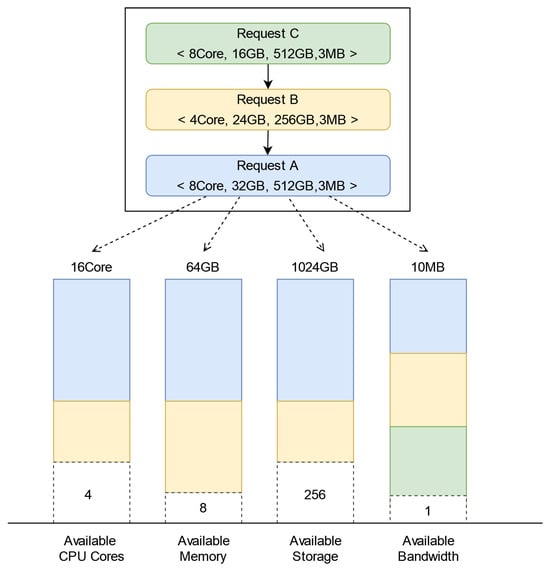 Following these two ID fields are the QoS field, Cost field, and Resource Request Quantity field. The QoS field is filled with the User’s QoS constraint for resource scheduling delay: Scheduling_Delay. The Cost field is filled with the maximum cost that the User is willing to accept for CRN usage: Max_Price. The Resource Request Quantity field is filled with the specific resource request quantities in CPU, memory, storage, and bandwidth dimensions: RRQ_Core, RRQ_Memory, RRQ_Storage, and RRQ_Bandwidth, respectively. The values of these three fields, along with the Destination ID field’s computing resource service identifier, collectively constitute the User’s hard constraints on resources.