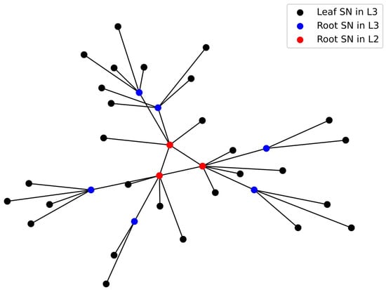 - Adjacency relationships are established between the root SN and all leaf SNs to form a tree-structured logical topology.