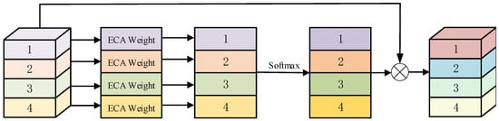 Here, the term denotes 1D convolution. The symbol signifies the Sigmoid activation function. The variable k denotes the number of neighbors surrounding a specific channel in , and it can be determined by the channel dimension c. Consequently, for a given channel dimension c, k can be expressed as