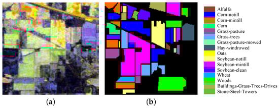 The Indian Pines (IP) HSI dataset, collected by the United States Department of Agriculture (USDA) through the AVIRIS sensor, is situated in the southwestern region of Indiana, USA. It has a spatial resolution of 20 × 20 m, covers 224 spectral bands, and has a total pixel count of 21,025. After eliminating noise, which involves removing 24 bands and 10,776 pixel samples, 200 bands and 10,249 pixel samples are retained for classification purposes. The detailed distribution of the samples across each category is presented in Table 2. The false color map image is depicted in Figure 5a, while the ground truth map is presented in Figure 5b.