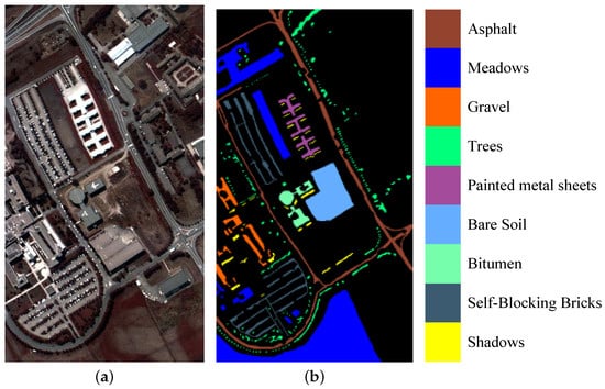 The Pavia University (UP) HSI dataset, affiliated with the University of Pavia, forms a component of an environmental monitoring initiative for the city of Pavia, Italy, employing the Reflective Optics System Imaging Spectrometer(ROSIS-3) sensor jointly developed by Dornier Satellite Systems, the GKSS Research Center and the German Aerospace Center. Comprising 115 continuous spectral bands, the dataset retains 103 spectral bands for classification following the removal of 12 bands affected by noise, as detailed in Table 3. Encompassing 42,776 pixel samples distributed across nine distinct categories, the false color map and ground truth map of the dataset are depicted in Figure 6a,b, respectively.