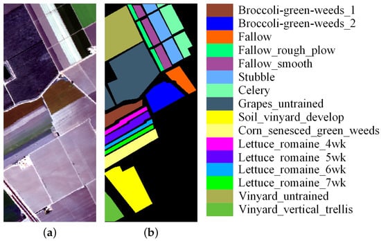 Ultimately, the Salinas (SA) HSI dataset was obtained by NASA through the AVIRIS sensor, capturing imagery of the Salinas Valley region in Central California, USA. The dataset boasts an image resolution of 3.7 m. As outlined in Table 4, it comprises 54,129 samples categorized into 16 distinct land cover types. Following adjustments, the dataset is composed of 204 bands available for classification. Figure 7 visually illustrates the false color representation and ground truth representation of this dataset.