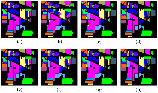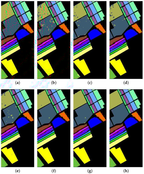 Classification maps for the IP dataset under seven methods. (a) Ground truth, (b) SVM, (c) 2D-CNN, (d) 3D-CNN, (e) HybridSN, (f) SSFTT, (g) MDRDNet, (h) MSA-LWFormer.