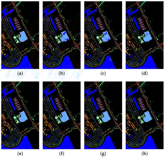 Classification maps for the UP dataset under seven methods. (a) Ground truth, (b) SVM, (c) 2D-CNN, (d) 3D-CNN, (e) HybridSN, (f) SSFTT, (g) MDRDNet, (h) MSA-LWFormer.