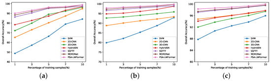OA of different methods when using different ratios of training samples. (a) IP dataset. (b) UP dataset. (c) SA dataset.