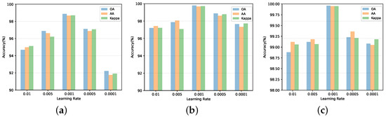 Influence of learning rate on classification accuracy. (a) IP dataset. (b) UP dataset. (c) SA dataset.