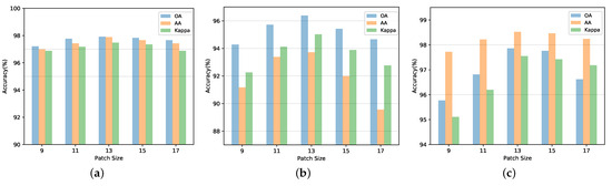 Influence of patch size on classification accuracy. (a) IP dataset. (b) UP dataset. (c) SA dataset.
