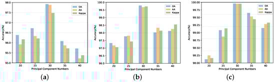 Influence of number of principal components on classification accuracy. (a) IP dataset. (b) UP dataset. (c) SA dataset.