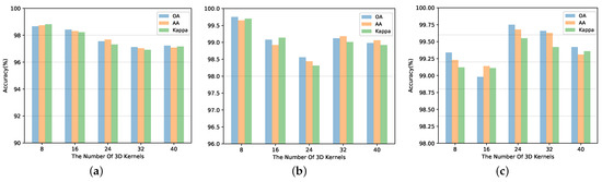 Influence of 3D convolution kernel number on classification accuracy. (a) IP dataset. (b) UP dataset. (c) SA dataset.