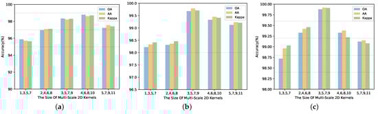 Influence of multi-scale 2D convolution kernel size on classification accuracy. (a) IP dataset. (b) UP dataset. (c) SA dataset.