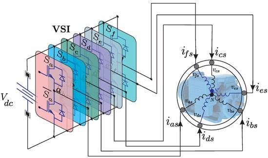 The FCS-MPC strategy makes use of the mathematical model of the system, which is composed of an ASPIM fed through a six-leg voltage source inverter (VSI) connected to a DC voltage source as shown in Figure 1. In this respect, a continuous mathematical model of the ASPIM can be defined by differential equations. To simplify the six-dimensional space of the model with six phases (a, b, c, d, e, f), the vector space decomposition (VSD) technique was considered, that allows the analysis to be performed through three two-dimensional orthogonal planes in the stationary frame references denoted as (), () and (), using (1) and based on the invariant amplitude criterion []. In addition, the ASPIM has a phase shift of between the three-phase systems along with an isolated neutral configuration; therefore, it is assumed that the currents () are zero. The adoption of the VSD approach imparts a significant physical significance to the current profiles. Specifically, the alfa-beta current components are associated with electromechanical energy conversion. In contrast, the () components primarily contribute to the machine’s losses and do not actively participate in torque and flux generation. This clear distinction between the two sets of current components enhances the understanding and interpretation of the machine’s operation and facilitates the implementation of FCS-MPC for improved performance.