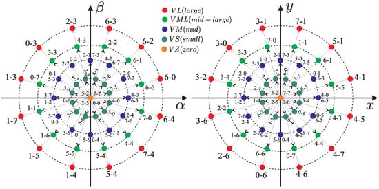 On the other hand, the six-phase VSI consists of two isolated gate bipolar transistors (IGBT) per phase. This VSI has discrete behaviour with a total number of possible switching outputs defined by . The combination of the different switching states and the DC voltage source sets the voltages per phase. The 64 possibilities of the voltages, according to the VSD approach, are represented in Figure 2 in which only 49 different vectors (48 vectors + 1 null vector) are considered different in () and () planes. Hence, the state-space mathematical model of ASPIM can be written as follows: