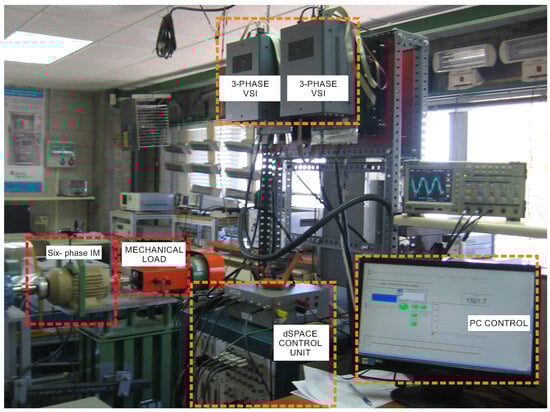 Photo of the experimental bench including the ASPIM, the dSPACE platform, the eddy current brake and the six-phase VSI.