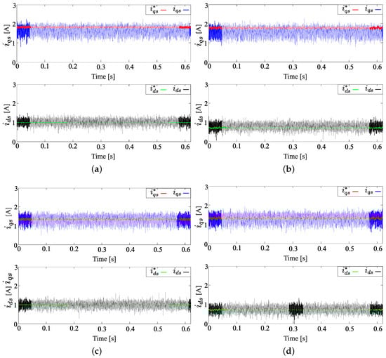 Stator currents , and , at different speeds for both MPCC and MPCC-R: (a) MPCC at 2550 rpm; (b) MPCC at 3400 rpm; (c) MPCC-R at 2550 rpm; (d) MPCC-R at 3400 rpm.