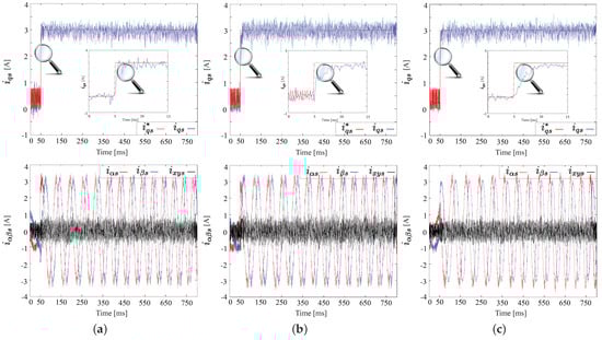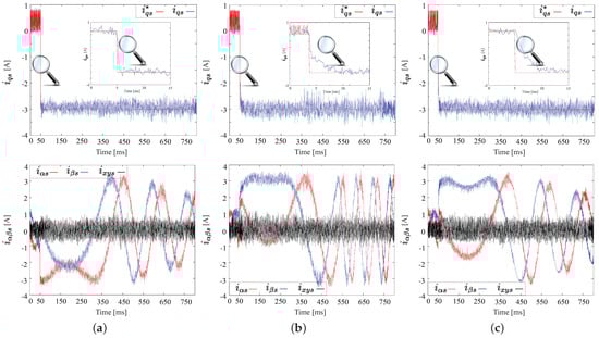 Transient response of stator currents (q), () and () from a speed step response of 500 to 2000 rpm ( response of to 3 A): (a) MPCC; (b) MPCC-PI; (c) MPCC-R.