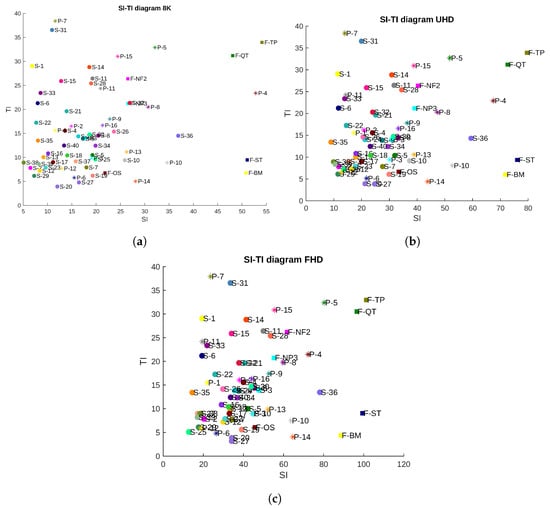 All three SI-TI diagrams, one for each resolution using the [28], are shown in Figure 1. In all these plots, all the sequences of all three datasets are depicted. Particular datasets are distinguished by different markers, namely the squares representing the Fraunhofer dataset, the circles representing the SEPE dataset, and the asterisks representing the PP8K dataset; each sequence is marked by a different color. Before the serial number of each sequence, a letter representing the abbreviation of the dataset is written, namely “F” for “Fraunhofer”, “S” for SEPE, and “P” for the“PP8K” dataset.