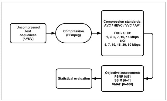 For our study, all the test sequences were encoded to the tested compression standards, namely H.264/AVC, H.265/HEVC, H.266/VVC, and AV1 using the FFmpeg tool [27]. Since there is no support for VVC in FFmpeg, according to [29], the patch that included VVC support was manually submitted to FFmpeg. The bitrate range was set to 1, 3, 5, 7, 10, and 15 Mbps for FHD and UHD resolutions and to 5, 7, 10, 15, 30, and 50 Mbps for 8K resolution, respectively. Altogether, 420 test sequences were encoded. The group of pictures (GoPs) was set to 60 for the Fraunhofer and PP8K datasets and 30 for the SEPE dataset, which determines the condition that every second, an intraframe (I) frame occurs. The structure of the GoPs is referred to by two numbers—N and M, where N stands for the distance between two keyframes, i.e., I frames, also known as the length of the GoPs, and M stands for the distance between two anchor frames (I or P). Since the GoPs settings, except the I frame distance, were set as default by all codecs, the GoPs structure was as follows: the H.264/AVC N = 60 and the M = 4, the H.265/HEVC N = 60 and M = 5, and the AV1 N = 1 and M = 1. For H.266/VVC, the intraperiod was set to 64, perceptual optimization was enabled, and the decoding refresh type was CRA, which stands for clean random access. For all codecs, no certain profiles and presets were set within the encoding process. All the encoding parameters are displayed in Table 3. We decided to use average bitrate coding (ABR), which means that only the target bitrate parameter was set. Since the H.264/AVC and H.265/HEVC codecs were not designed to encode videos at 8K resolution, two-pass encoding was used to ensure that the target bitrate was as accurate as possible for these two standards. The command lines that show the encoding settings for particular codecs are listed in Table 4. A flowchart highlighting the encoding and evaluating process is depicted in Figure 3.