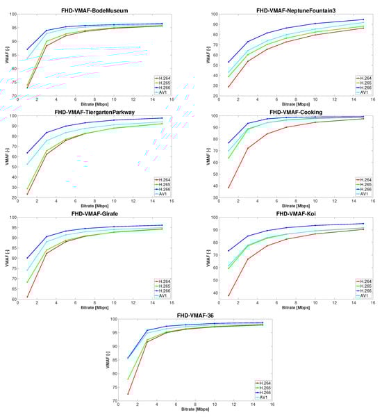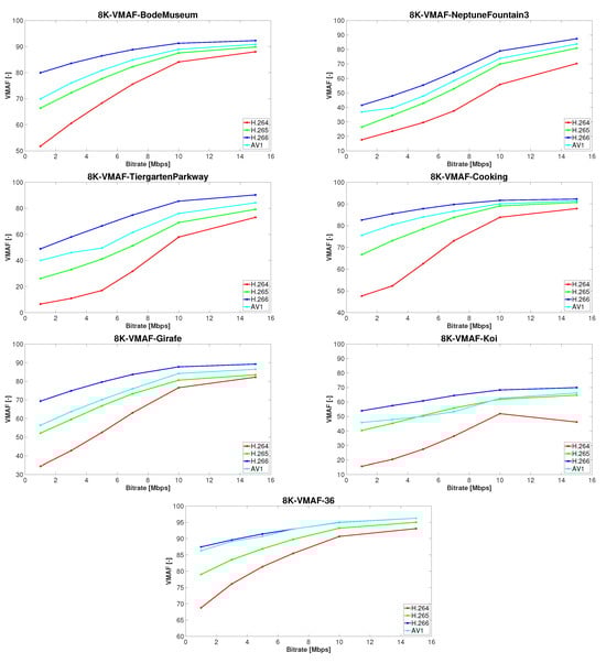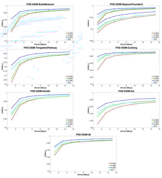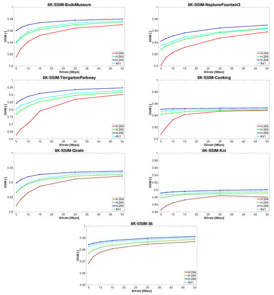 The results are presented in two parts. In the first one, we selected PSNR to compute the bitrate savings in terms of the Bjøntegaard delta (BD-rate) model [33], where the BD-rate (in percentage), as well as BD-PSNR (in dB), are calculated from the area located between two rate-distortion (RD) curves. The results are shown in Table 5, Table 6, Table 7, Table 8, Table 9 and Table 10, where each of these tables represents values at specific resolutions, i.e., 8K, Ultra HD, and Full HD, respectively. In each table, the bitrate savings for a particular test sequence are calculated and listed. In addition, Table 11 and Table 12 present the averaged bitrate savings depending on a specific codec. In the second part, we generated rate distortion plots using the aforementioned SSIM and VMAF quality metrics, as seen in Figure 4, Figure 5, Figure 6, Figure 7, Figure 8 and Figure 9. In each of these figures, seven plots are provided, one for each test sequence, which depict comparisons between the four codecs analyzed in our study. Each codec is highlighted in a different color, where red represents H.264/AVC, green represents H.265/HEVC, blue represents H.266/VVC, and cyan represents AV1. Figure 4, Figure 5 and Figure 6 show the SSIM rate distortion plots for the 8K, UHD, and FHD resolutions, whereas Figure 7, Figure 8 and Figure 9 depict graphs of the VMAF rate distortion for the same above-mentioned resolutions.