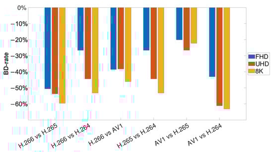 When looking at the results, we can notice that H.266/VVC outperforms all other codecs, namely H.264/AVC, H.265/HEVC, and AV1, respectively. The biggest difference, in terms of bitrate savings, is between VVC and H.264, starting at around 59% at FHD and ending at about 93% at 8K resolution. VVC also overcomes HEVC and varies from around 32% at UHD to about 78% at 8K resolution. AV1 appears to be the second most effective codec, as it outperforms H.264, ranging from around 33% at FHD to about 81% at 8K resolution, as well as HEVC, varying from 3% at FHD to around 44% at 8K resolution. The bitrate savings between the two currently most used compression standards, namely HEVC and H.264, start from around 14% at FHD to about 77% at 8K resolution. The difference in bitrate savings between the newly developed codecs, namely VVC and AV1, begins from around 1% for UHD and ends at about 70% at 8K resolution, which confirms that the H.266/VVC compression standard has the best coding efficiency and is promising for future utilization in storing and transmitting video content at 8K resolution. All the provided results vary depending on the test sequence used. Given the results, we can state that the bitrate savings between particular standards is greatest for sequences with low SI values, such as “Koi” or “Cooking” at 8K resolution, with approximately 69% and 67%; on the contrary, the smallest difference for sequences located in the middle of the SI-TI diagram were for “NeptuneFountain3” or “Giraffe” at 8K resolution at about 44% and 48%, respectively. Considering the results, it is also obvious that the bitrate savings between the newly developed compression standards (H.266/VVC or AV1) and the rest (H.265/HEVC or H.264/AVC) vary by resolution, with the largest at 8K resolution and gradually decreasing towards FHD resolution. This trend is also confirmed by Figure 10, where each bar represents a value from Table 11. The resolution is highlighted by color, where yellow represents 8K resolution, red represents Ultra HD resolution, and blue represents Full HD resolution. This confirms the fact that the VVC and AV1 codecs have been primarily developed for videos at high resolutions, such as 8K and/or UHD.